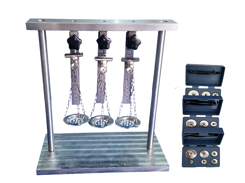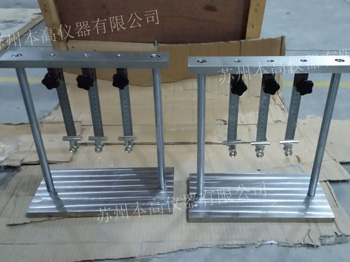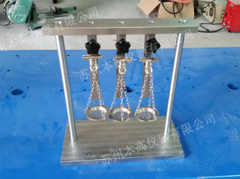 本裝置配合高溫烘箱使用,試樣懸掛在裝置上并置于烘箱中,下夾頭加重物,在10分鐘后,測量標記間的距離并計算伸長率。